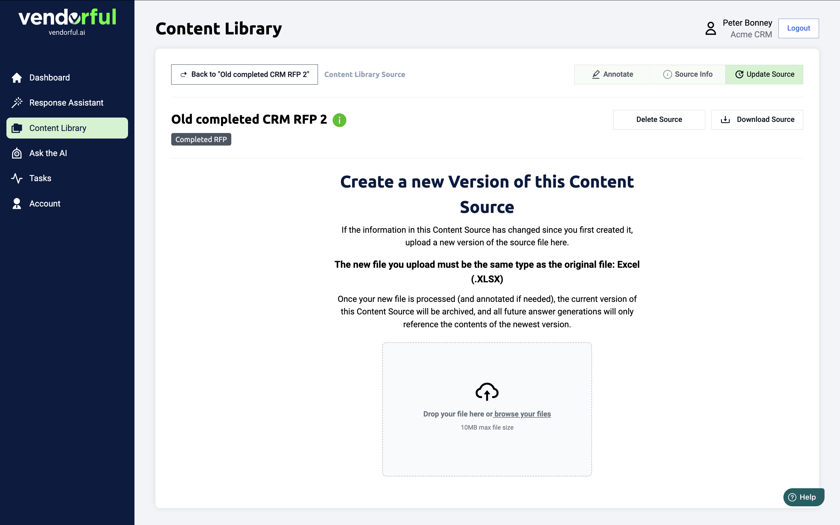 Sometimes a content library will have outdated information that you simply want to remove, like an old completed RFP or RFI. But frequently there is an updated version of a source document that you want to use to seamlessly replace the old version, while preserving a record of the original so you can audit past questionnaire responses.